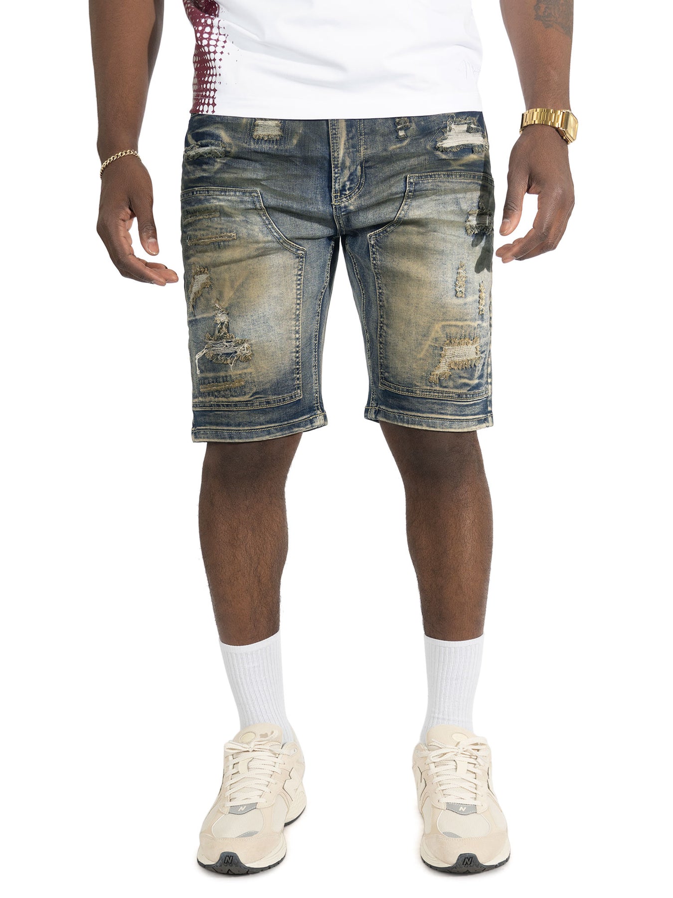 The M904 Prego Denim Shorts from Makobi Streetwear bring rugged street style with a clean, modern wash. With a fine-drawn fading swatches for a worn-in, vintage look. The Distressing Heavy rip-and-repair detailing with frayed patches and textured panel accents across the front. This Durable denim build with reinforced stitching and structured panel design. Pockets are in classic five styling with branded coin pocket detail. Tailored streetwear silhouette that sits comfortably at the waist with a modern above-the-knee cut. In an over-all vibe, it's an edgy, urban, and effortlessly cool — perfect for warm-weather street fits that still make a
