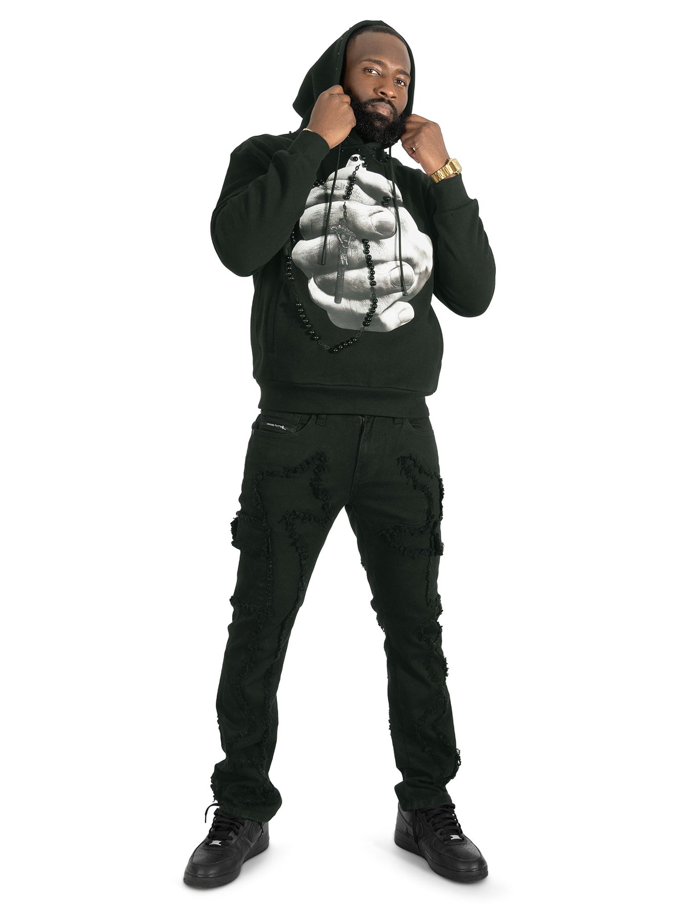 Designed for both comfort and style, it includes an adjustable drawstring hood, ribbed cuffs and hem, and a spacious front pocket for everyday functionality. The back showcases a powerful scripted message, adding depth and attitude to the overall look. Perfect for layering or wearing on its own, the Makobi Rosario Hoodie blends urban fashion with expressive artwork, making it a standout piece for casual and streetwear-inspired outfits.