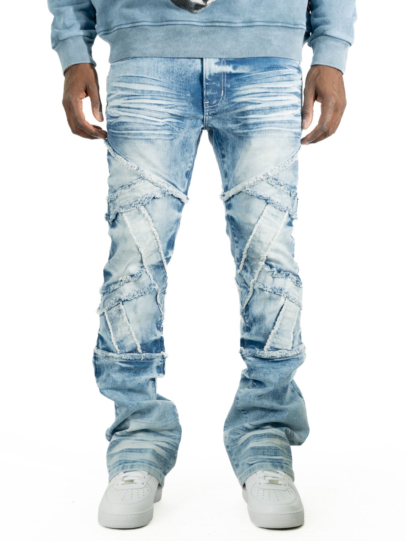 The M1908 Makobi Veneta Stacked Jeans deliver a striking streetwear statement. With its standout patchwork design and signature stacked 36" silhouette, it is crafted from premium stretch denim, these jeans feature detailed paneling, distressed accents, and intricate stitchwork that add depth and texture to every look. The stacked leg construction creates a modern elongated fit, perfect for pairing with sneakers or boots for a layered, fashion-forward vibe. Available in multiple washes—from vintage blue to edgy black—each pair offers a unique, worn-in aesthetic while maintaining comfort and durability for everyday wear. Designed for those who want to stand out, the Venetta Stacked Jeans combine rugged detailing with contemporary style.