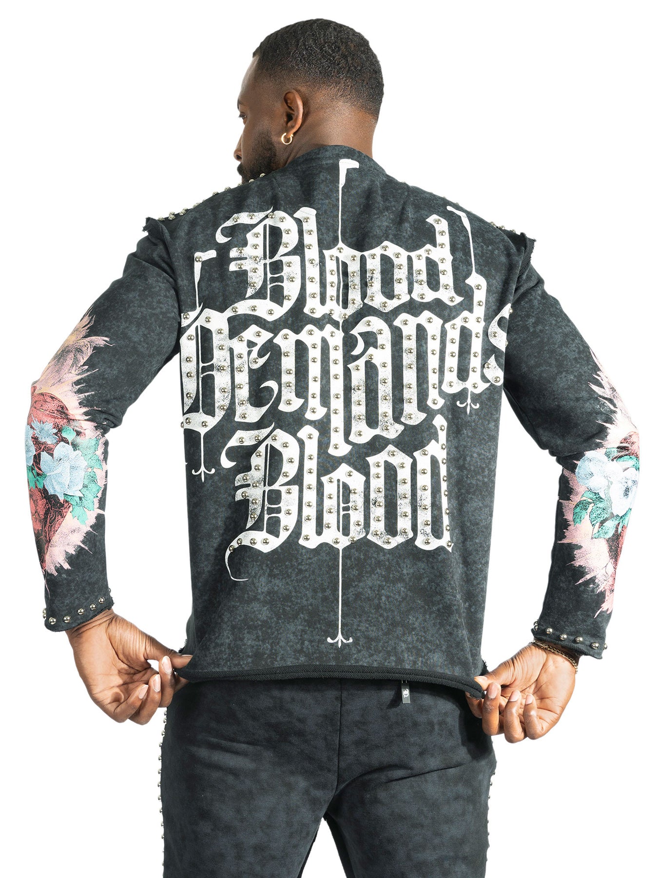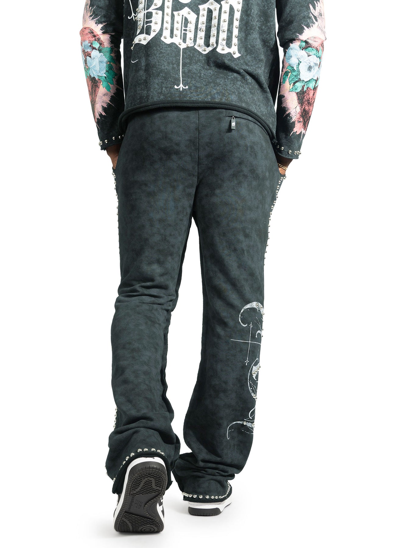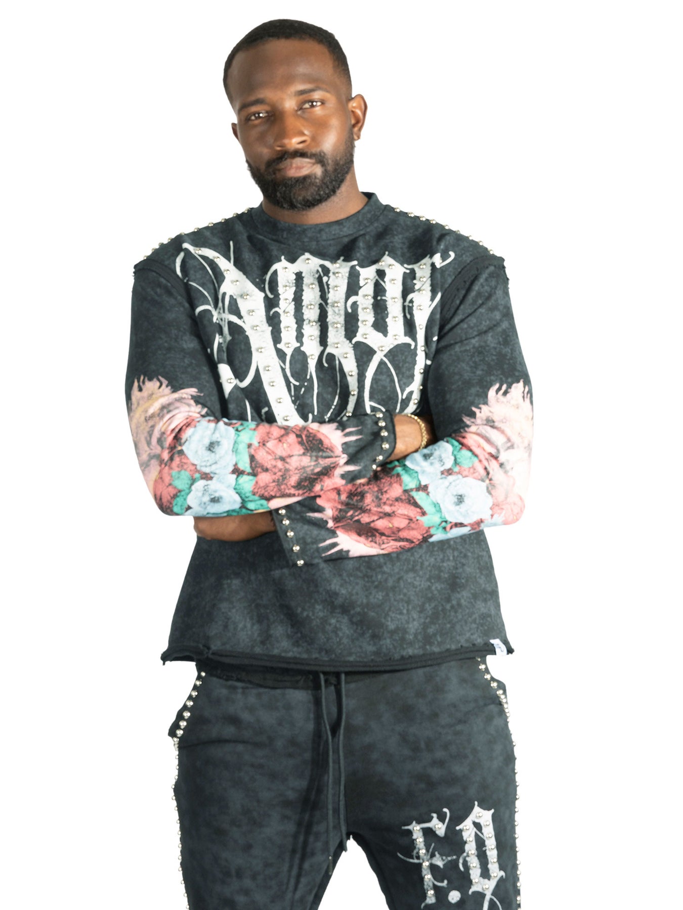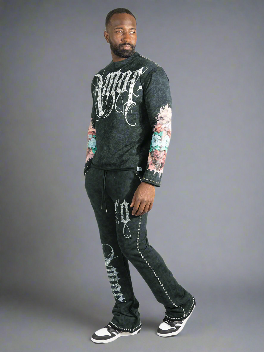 Turn heads in this standout acid-wash co-ord set that fuses vintage flair with modern street grit. The long-sleeve top features an oversized gothic-style “Amor” print across the chest, flanked by bold, high-contrast sacred heart and floral motifs on the sleeves that inject a burst of vibrant red, blue, and green into the muted palette. The back doesn't hold back either, with a heavy-hitting "Blood Demands Blood" statement in ornate blackletter script — pure attitude. Adding edge and luxury, pearl-like studs line the shoulder seams, sleeve cuffs, waistband, and pant legs, offering a glam-rock twist to this rebellious look. The matching joggers keep the energy going with distressed-style typography reading "F.O" on the thigh and a mirrored gothic design running vertically down one leg. Built for comfort with a drawstring waistband, but styled to steal the spotlight.