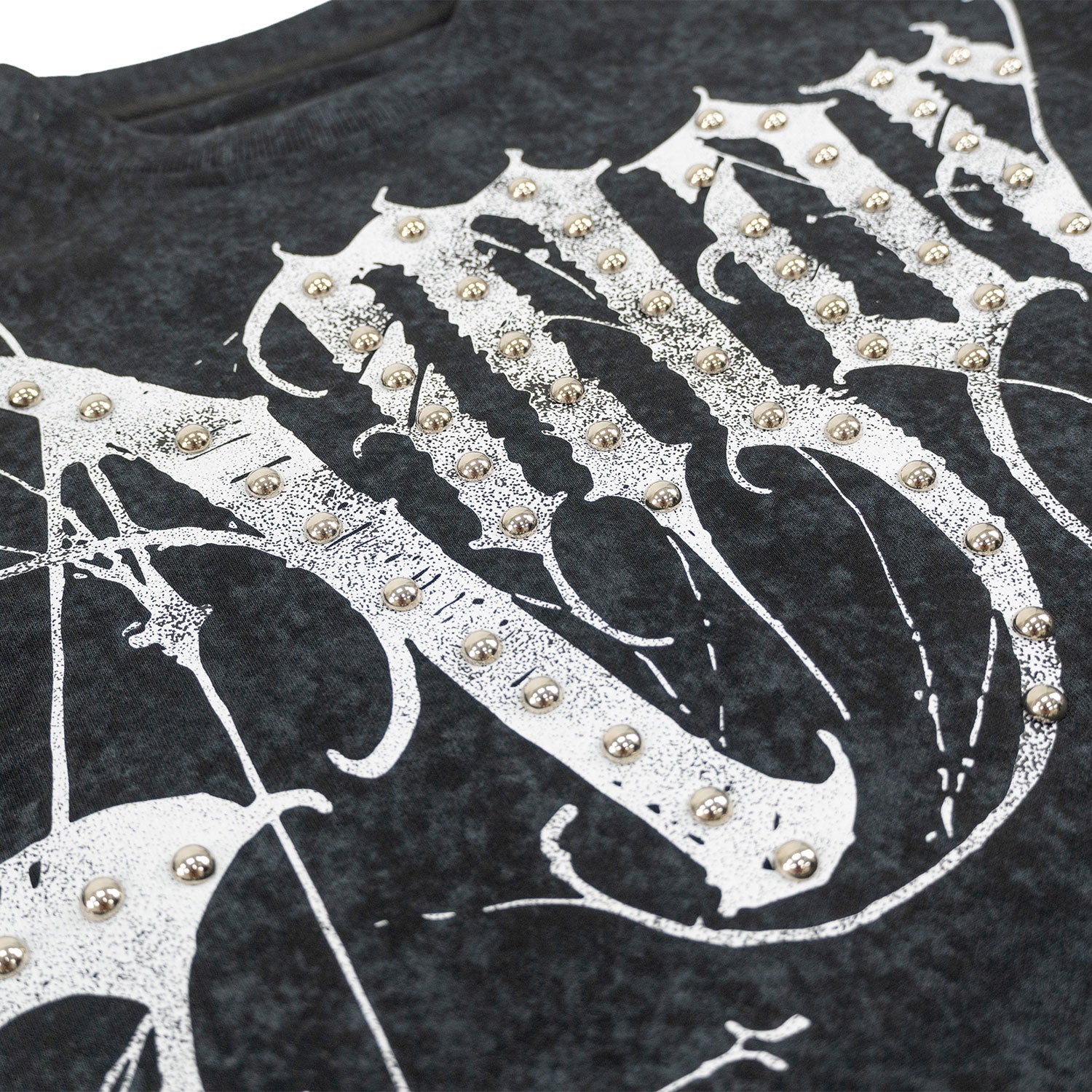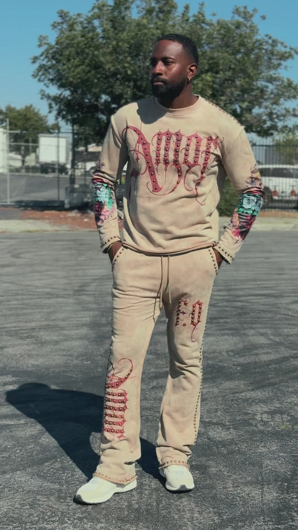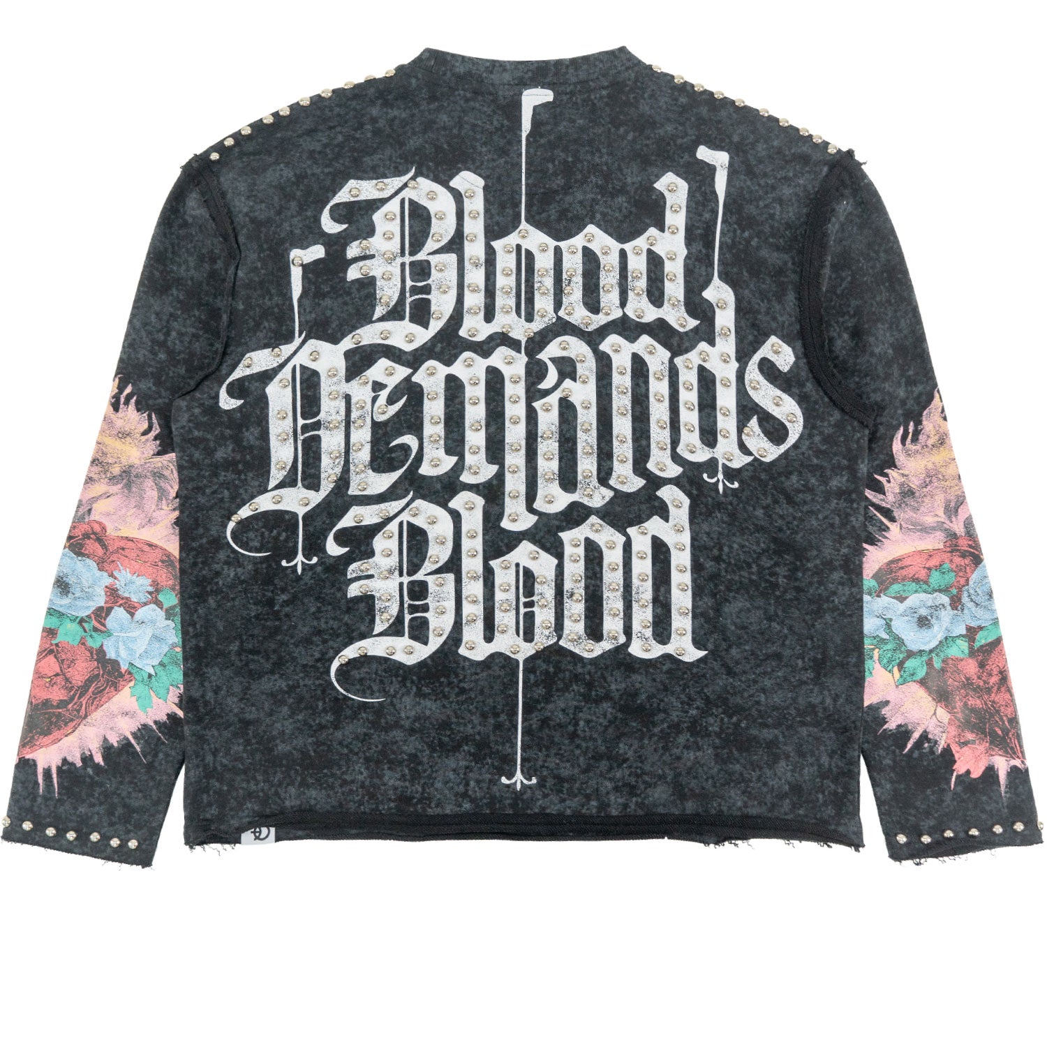 Turn heads in this standout acid-wash co-ord set that fuses vintage flair with modern street grit. The long-sleeve top features an oversized gothic-style “Amor” print across the chest, flanked by bold, high-contrast sacred heart and floral motifs on the sleeves that inject a burst of vibrant red, blue, and green into the muted palette. The back doesn't hold back either, with a heavy-hitting "Blood Demands Blood" statement in ornate blackletter script — pure attitude. Adding edge and luxury, pearl-like studs line the shoulder seams, sleeve cuffs, waistband, and pant legs, offering a glam-rock twist to this rebellious look. The matching joggers keep the energy going with distressed-style typography reading "F.O" on the thigh and a mirrored gothic design running vertically down one leg. Built for comfort with a drawstring waistband, but styled to steal the spotlight.