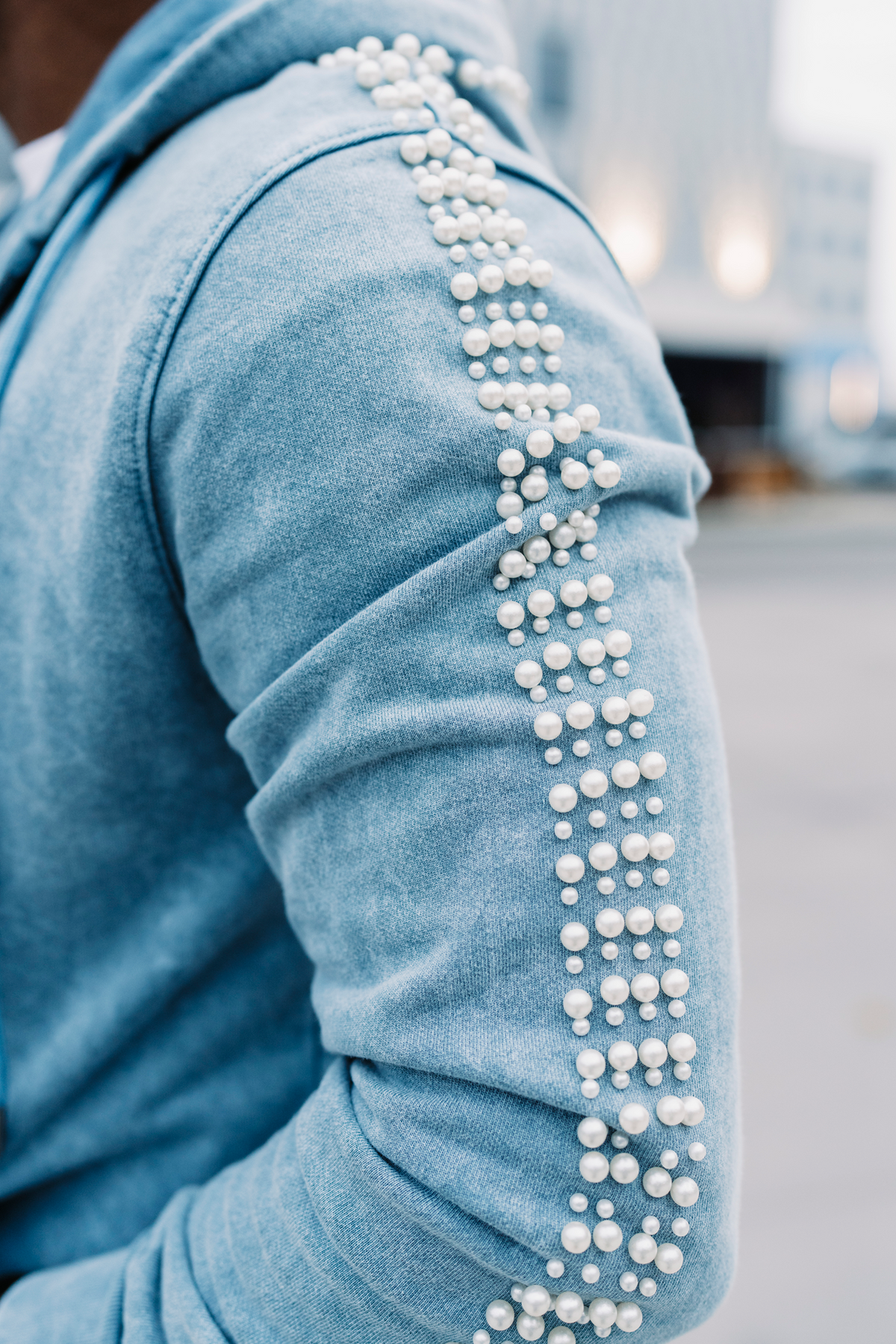 The zip-up hoodie features studded accents along the shoulders, sleeves, pockets, and hood, adding a luxury edge to a classic silhouette. A rhinestone “FO” logo sits on the chest, while the back showcases a statement graphic reading “Blind Faith Causes Man’s Greatest Sins” — finished with shimmering rhinestones for maximum impact.