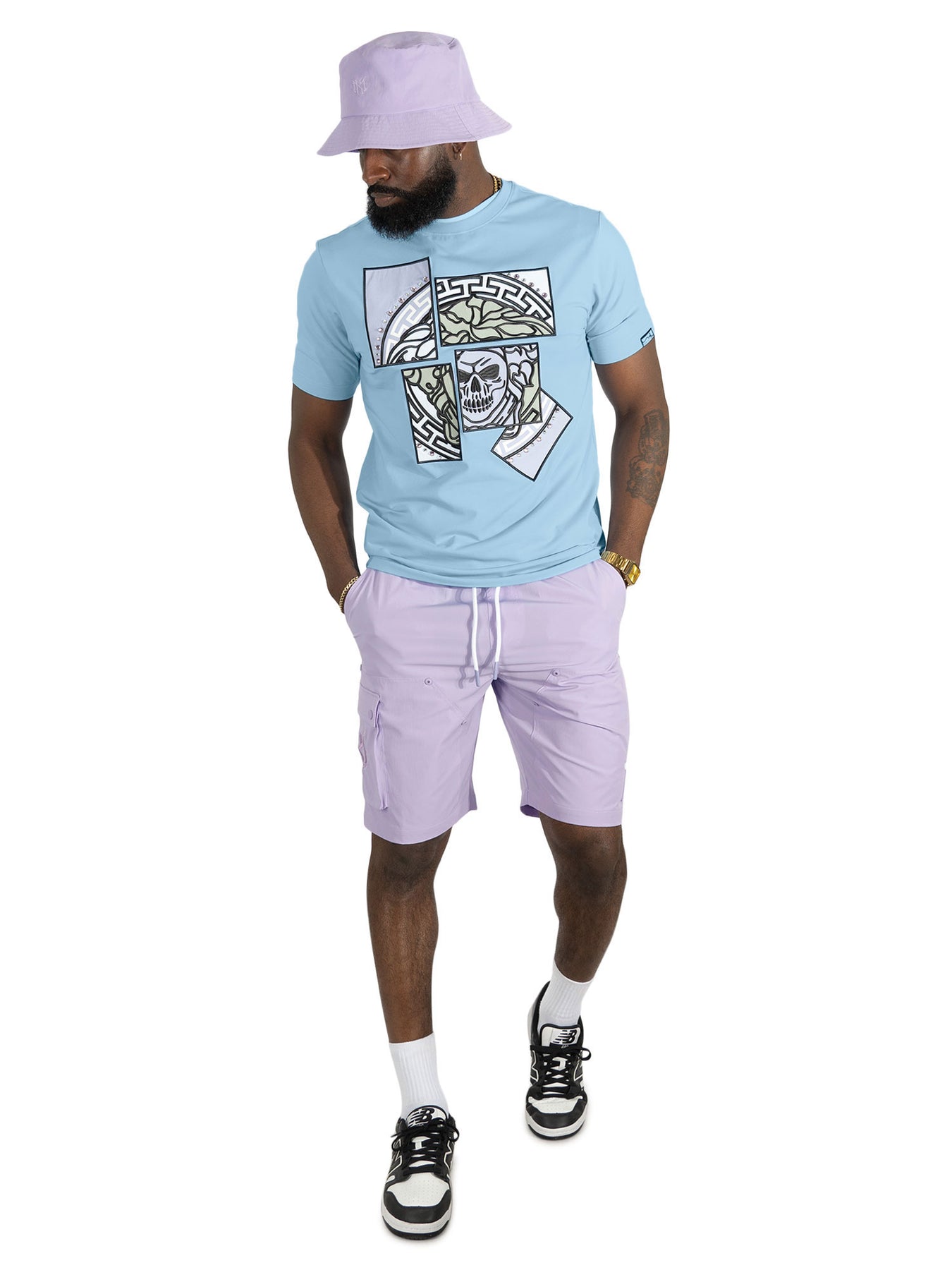 The Makobi M193 Bianco Medusa Jersey Shirt delivers valiant streetwear energy with a striking artistic design. Featuring a sleek black base, the shirt showcases a powerful Bianco Medusa graphic across the chest, divided into geometric panels that combine a Medusa-inspired motif, Greek key patterns, and skull artwork in red, white, and grey tones. This layered graphic layout gives the shirt a modern, high-impact look that instantly stands out in any streetwear fit.