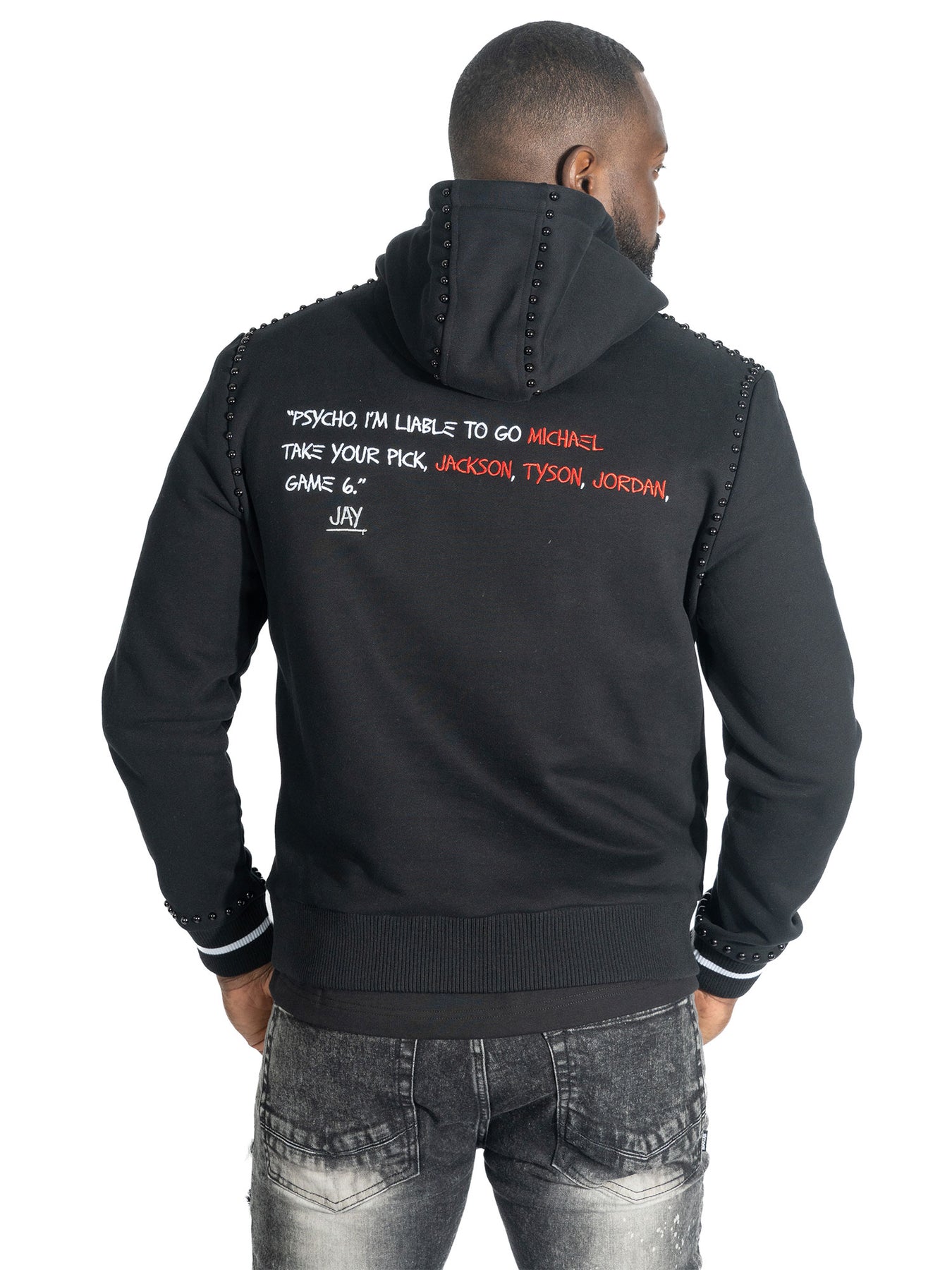 Studded accents on hood, sleeves, and pockets